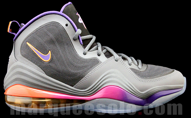 Get out your #1 Phoenix jerseys, the Nike Air Penny V “Suns” is on its way. Purple and orange accents pay tribute to Anfernee’s days in the desert on this dateless drop, with a grey base emphasizing casual wear.