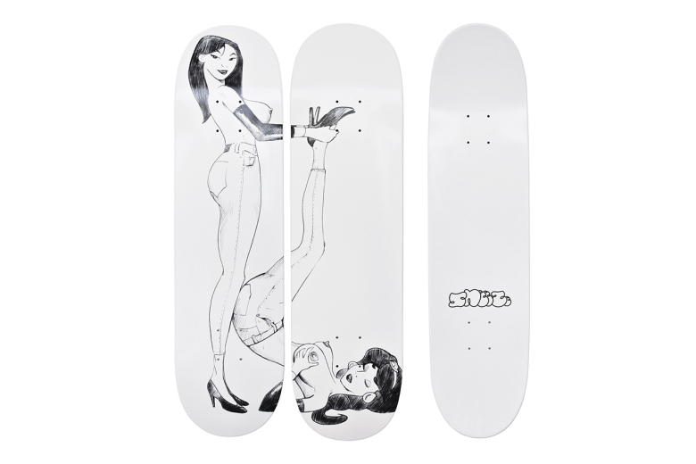 THE PETER CHUNG ILLUSTRATED DECKS BRING FORTH INSPIRATION FROM DESIGN CHARACTERS MULAN AND JASMINE IN A RATHER NON TRADITIONAL POSE. THE SET OF DECKS ARE AVAILABLE NOW FOR $154.00 USD AND CAN BE PURCHASED HERE AT http://commissarystores.com/collections/sneeze-mag/products/skateboard-set