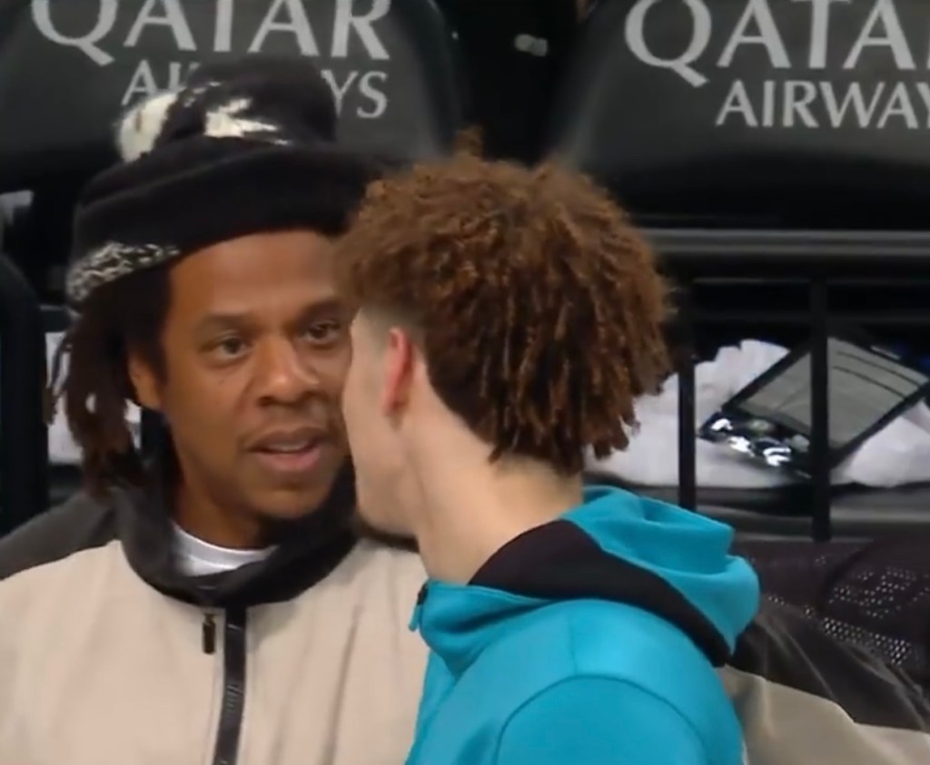 JayZ and OG Juan was in Barclays arena to watch the Brooklyn Nets face off against the red hot Charlotte Hornets lead by second year sensation LaMelo Ball. The Hornets took home the victory and during the halftime break Jayz and melo talked it up a bit LaMelo is signed to Jayz’s Roc Nation management group.