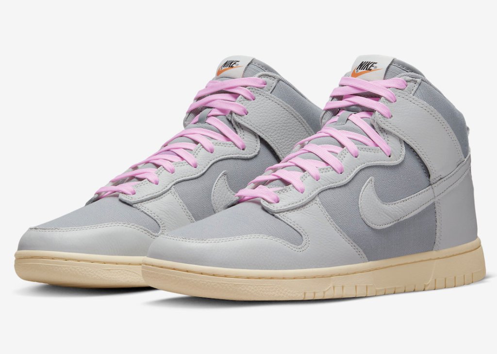 Coming to select retailers and online in the coming weeks the Nike Dunk HI the “CERTIFIED FRESH” sneakers the Grey leather on these are nice with the linen type fabric as a counter balance . The sail colored out-sole and the violet-pink laces set these things off and are a great look for the Summer months.